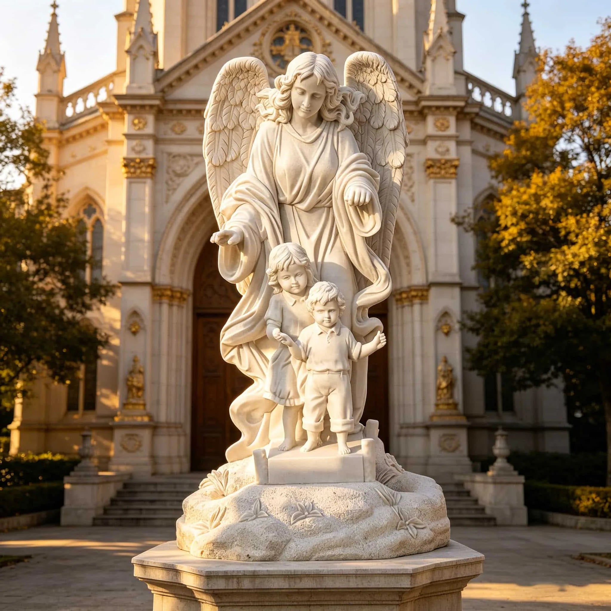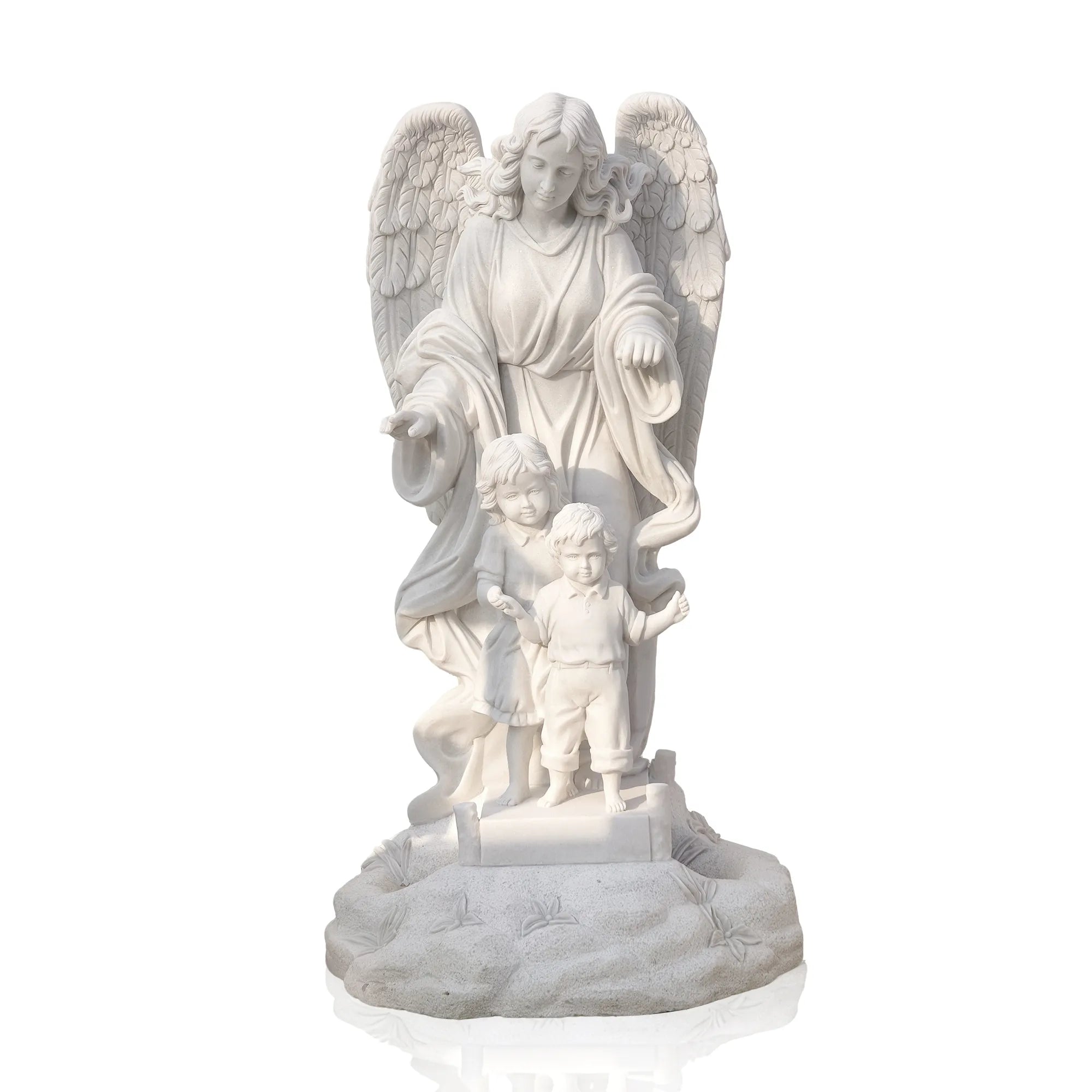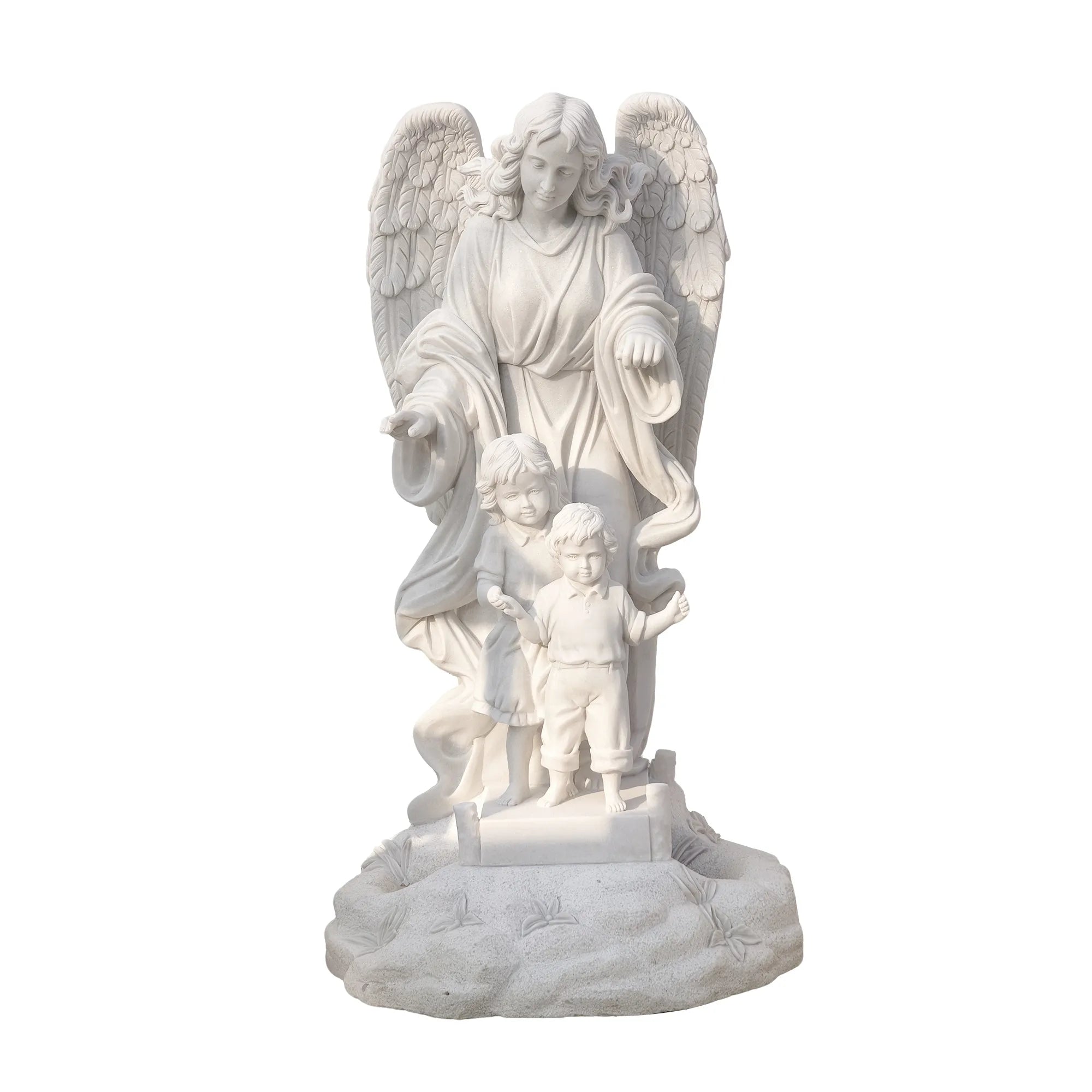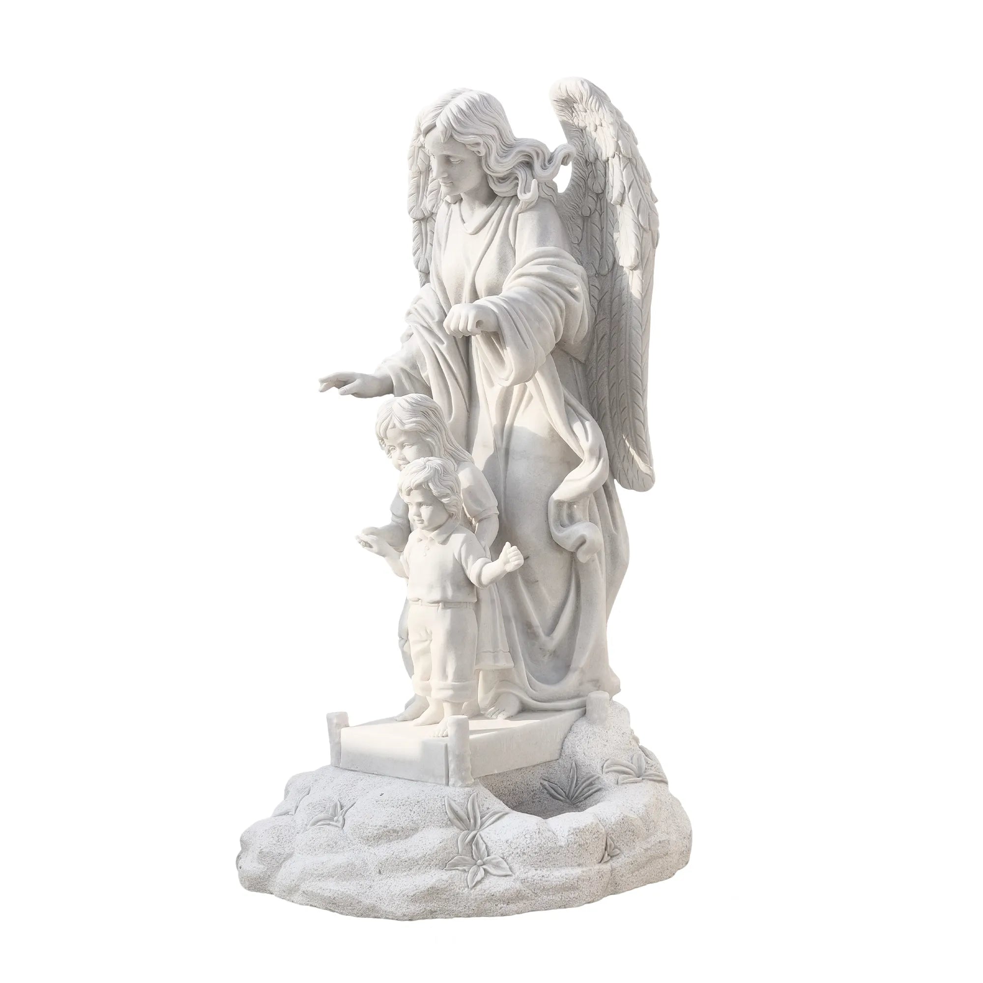 This marble guardian angel statue with children is a touching representation of protection, love, and spiritual guidance. Hand carved from natural white marble, the sculpture depicts a gentle angel watching over children, symbolizing care, innocence, and divine presence.