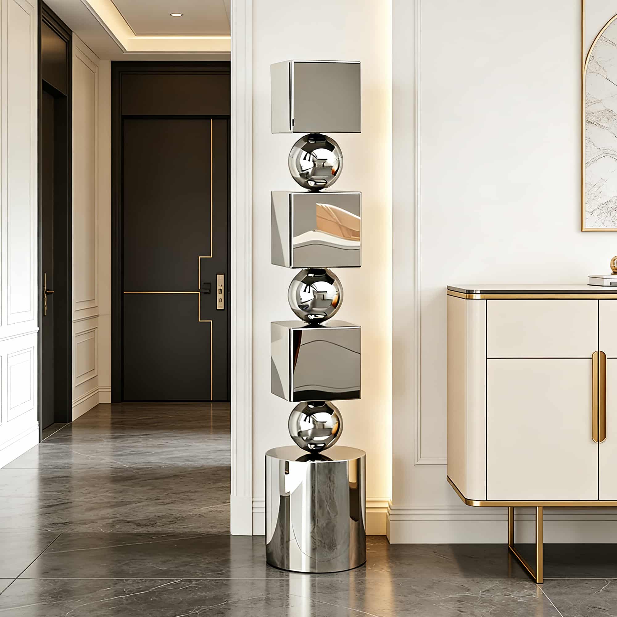 Crafted from high-quality stainless steel with a reflective finish, this sculpture enhances natural and artificial lighting, adding depth and sophistication to luxury living rooms, entryways, hotel lobbies, or corporate spaces. Its abstract geometric form complements modern, minimalist, and high-end interior aesthetics.