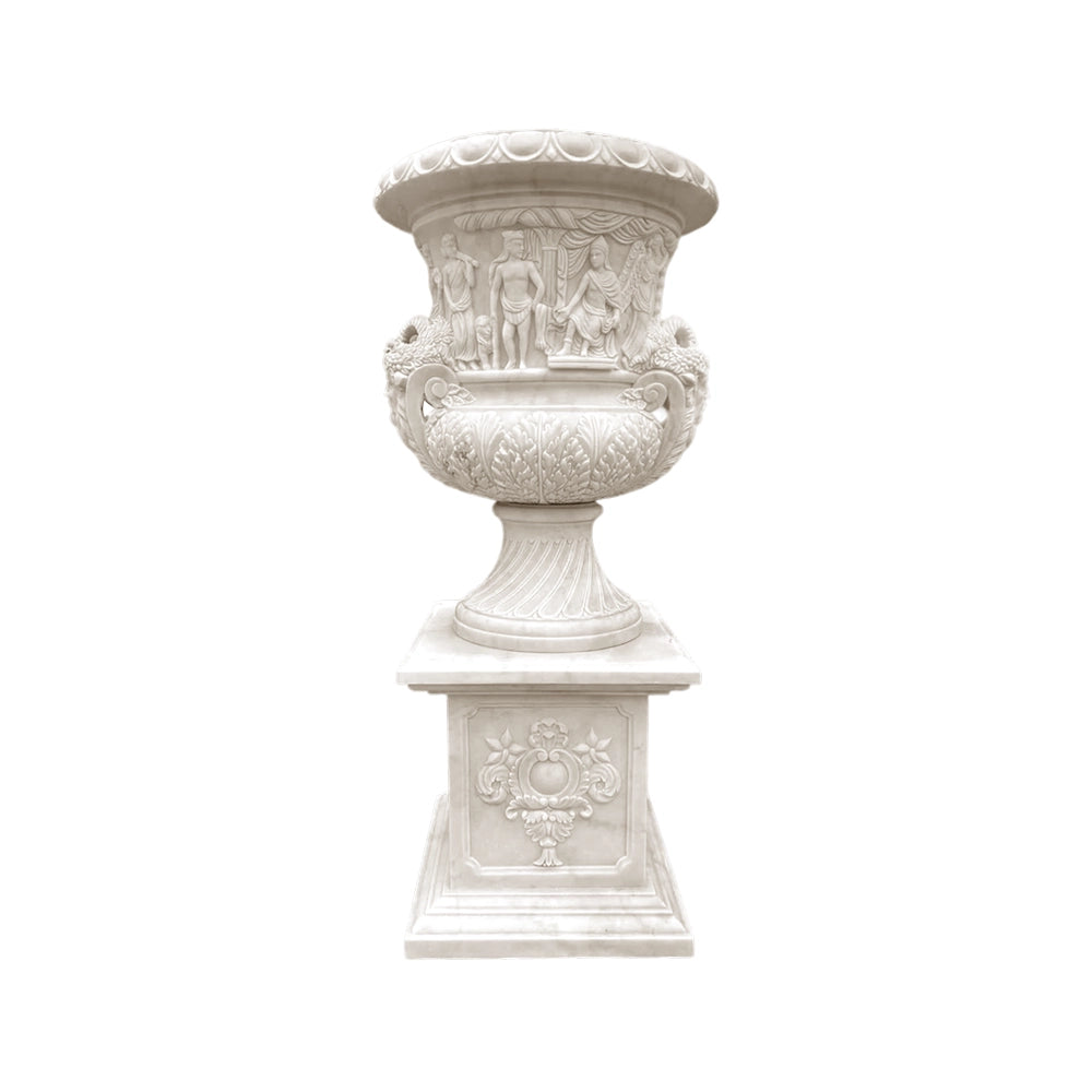 Crafted from premium white marble, this hand-carved stone urn stands out with intricate depictions of mythological figures, designed to complement European classical architecture. The design is enhanced by a pedestal base, giving the planter a stately presence while elevating the beauty of your outdoor space.